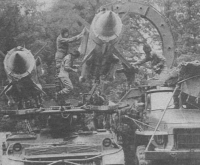 übernahme von Fla-Raketen vom Raketentransportfahrzeug 9T25. Da die
