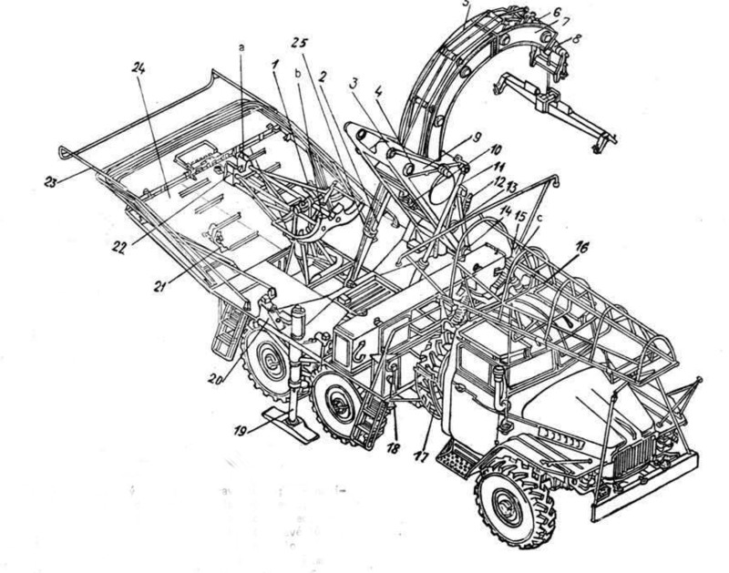 (2) Hydraulikgelenk, (3) Zurrbuchse des Trägers, (4) Winde,